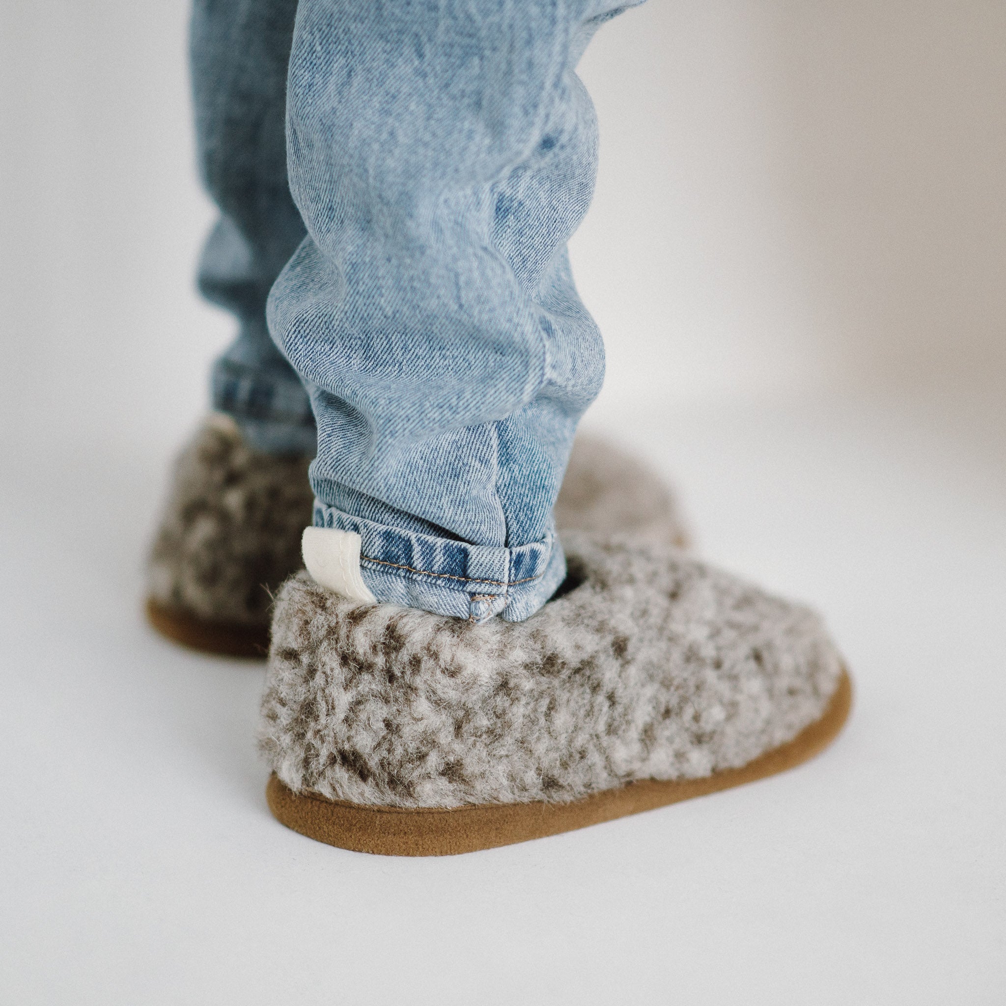 Die Wolle ist von Natur aus atmungsaktiv und sorgt für eine angenehme Temperatur – warm, aber nie zu heiß. Innen fühlen sie sich weich auf der Haut an, und die flexible Sohle macht das Gehen und Spielen ganz einfach.