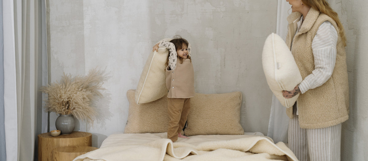 Wolle ist von Natur aus selbstreinigend — regelmäßiges Auslüften hält die Decke leicht und frisch, ganz ohne ständiges Waschen. Wenn eine gründlichere Reinigung nötig ist, helfen diese Schritte: