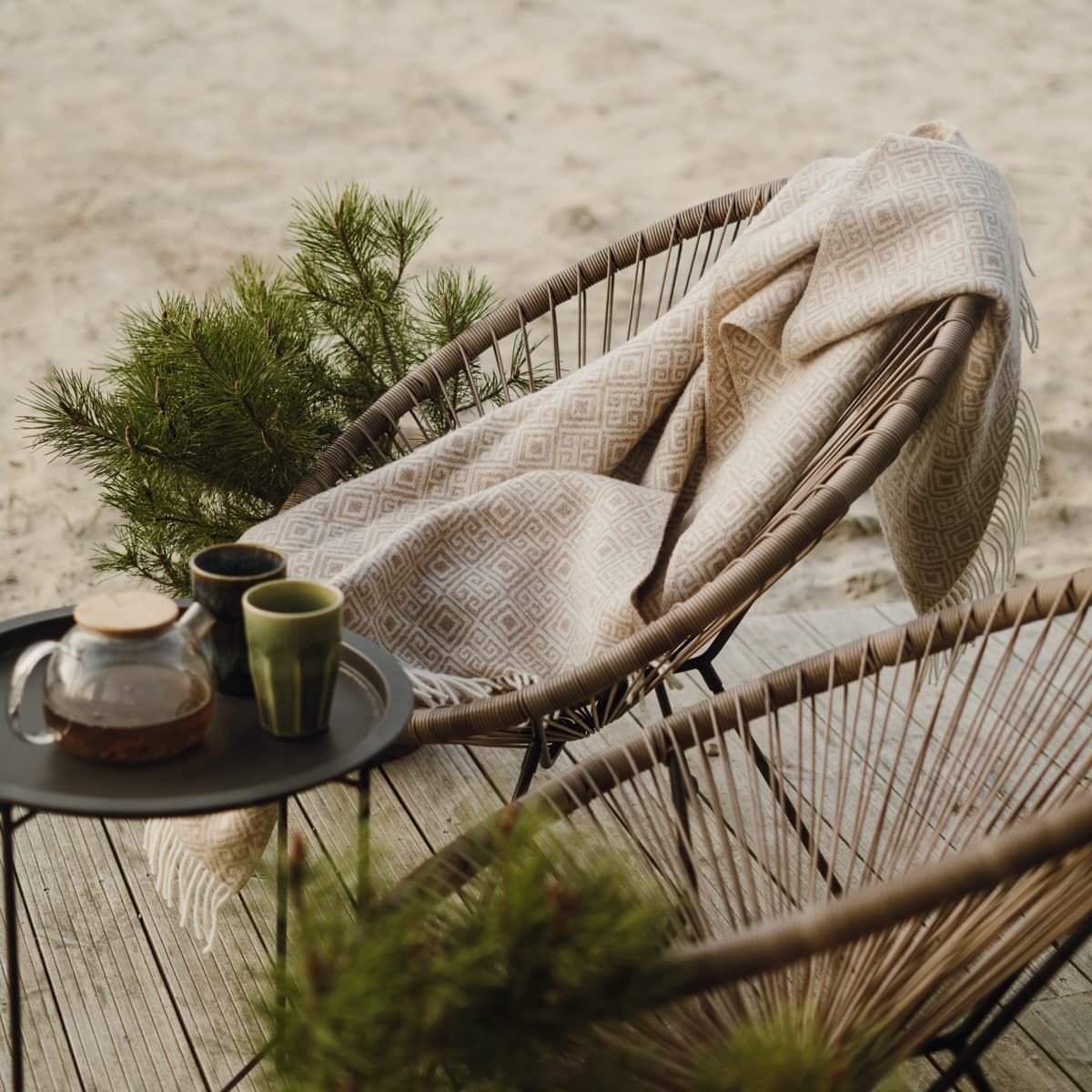 Das Plaid „Sirtaki“ besteht aus reinen Naturfasern, gefertigt mit Liebe zum Detail und Gespür für Textur. Jeder Faden trägt zu dem stillen Luxus bei, den nur echte Wolle bieten kann – ein einfaches Vergnügen, das schnell Teil des Alltags wird.